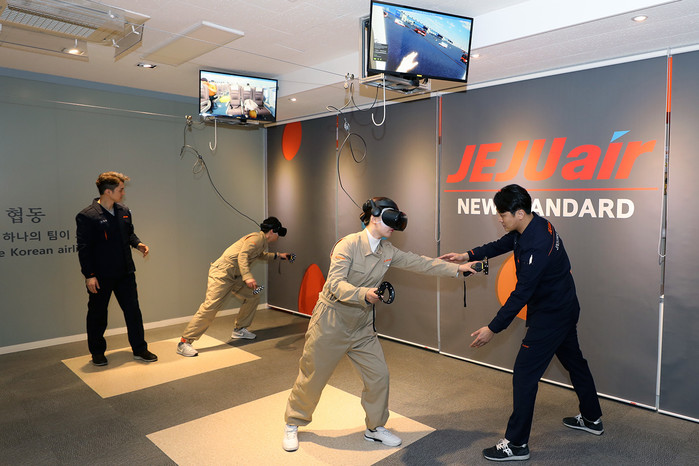 제주항공은 지난 1월부터 객실 승무원의 안전훈련에 가상현실 기술을 접목해 VR을 통한 훈련을 진행하고 있다.