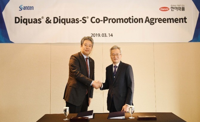 한미약품㈜(대표 우종수∙권세창)과 한국산텐제약㈜(대표 이한웅)은 14일 코엑스 인터컨티넨탈호텔에서 안구건조증 치료제 ‘디쿠아스®’, ‘디쿠아스-에스®’(성분명 디쿠아포솔나트륨)의 공동판매 계약을 체결했다.