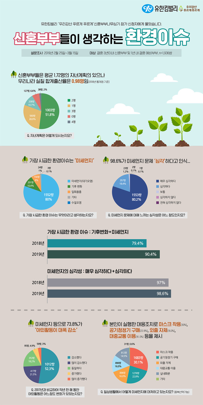 유한킴벌리(대표이사 사장, 최규복)가 2019 신혼부부 나무심기 참가 신청자를 대상으로 설문조사를 한 결과, 해당 신혼부부들이 원하는 자녀의 자녀 수는 약 1.72명으로 조사되었다. 이는 출산률이 역사상 처음으로 1명 이하(0.98)로 떨어진 상황에서 다소나마 위안이 되는 결과이다.