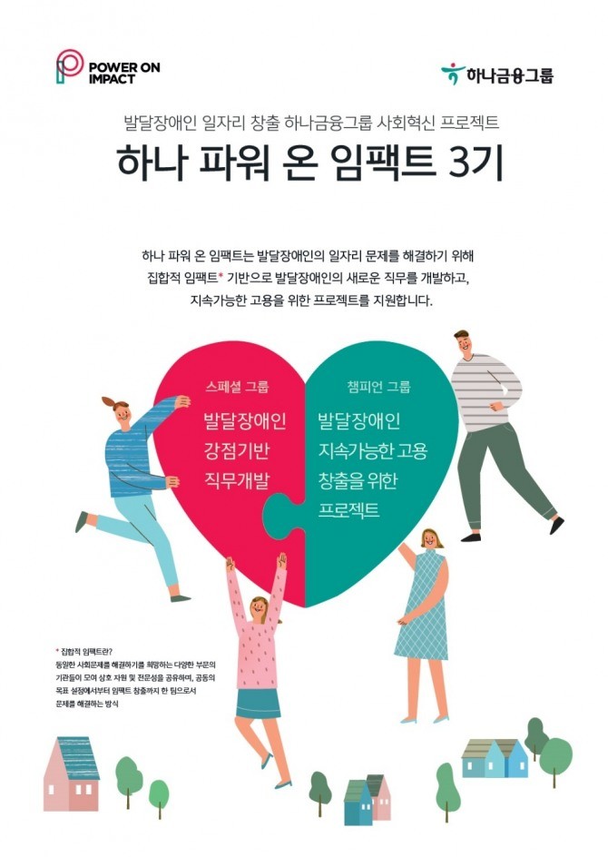 하나금융그룹은 발달장애인의 일자리 창출을 위한 사회혁신 프로젝트인 「하나 파워 온 임팩트(Hana Power on Impact)」 3기 사업에 참여할 사회혁신기업을 모집한다고 밝혔다.