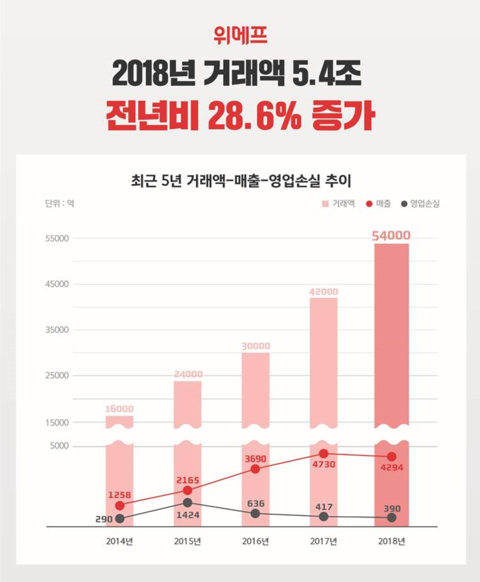 위메프는 2018년 실적 최종 집계 결과 연간 거래액(GMV, Gross Merchandise Volume) 5조4000억원을 기록했다고 3일 밝혔다. 매출과 영업손실은 각각 4294억원, 390억원이다.
